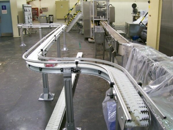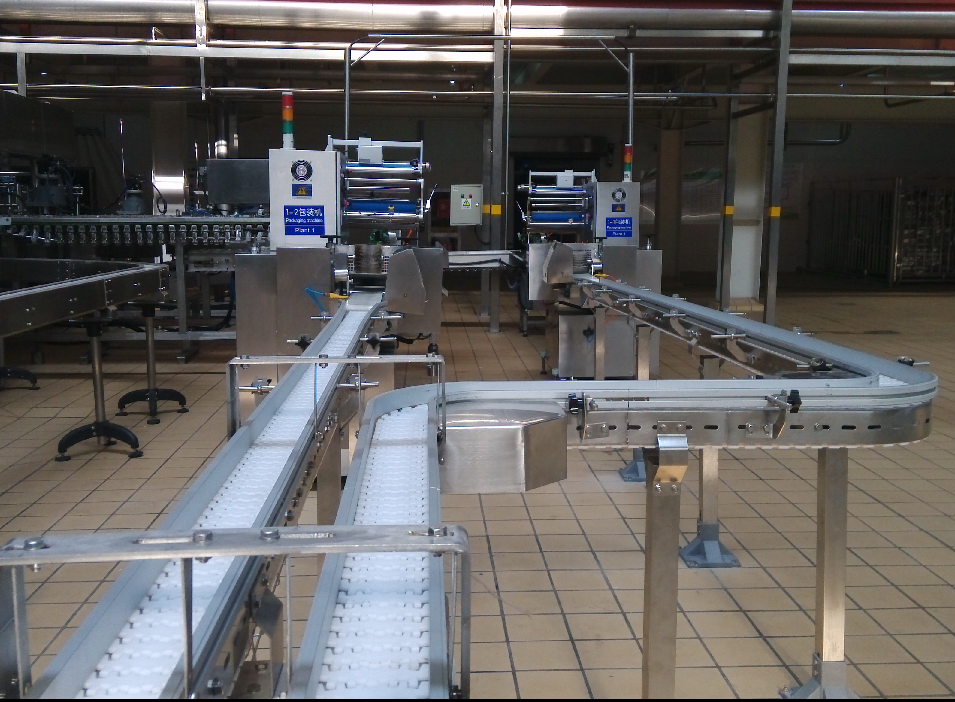 3.選用不同形式的平板鏈,可實現(xiàn)平面輸送、平面轉(zhuǎn)彎、提升下降等各種功能。
