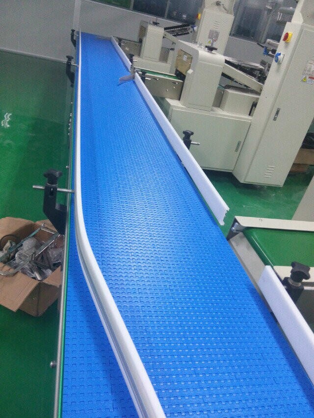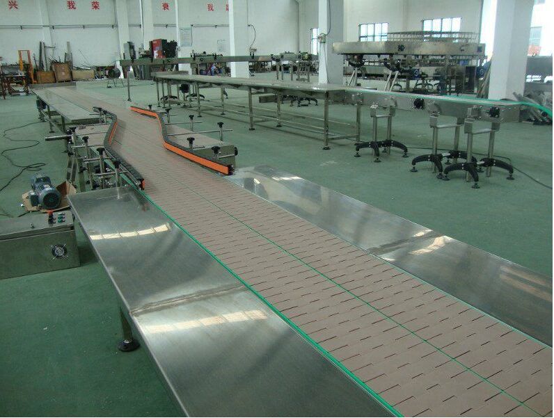 傳進牌鏈板流水線是在鏈式輸送機的兩側(cè)鏈條間加入板式構(gòu)件,以達到輸送形態(tài)不規(guī)則的物品。在鏈板上加裝專用工裝夾具。并根據(jù)工控要求可作為裝配線,或直接采用塑鋼平頂鏈式作為輸送載體。可實現(xiàn)彎道輸送。