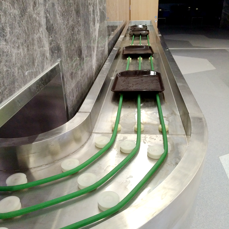 餐具輸送機又稱餐具回收傳送帶、餐廳餐盤傳輸機。常用于食堂,進行餐具回收,具有收集速度快,美觀,安全,高效,穩(wěn)定的性能,能在短時間內(nèi),將就餐人員的餐具,碗盤從餐廳輸送到廚房內(nèi),可用于餐盤,碗筷,調(diào)羹等餐具物品的輸送。